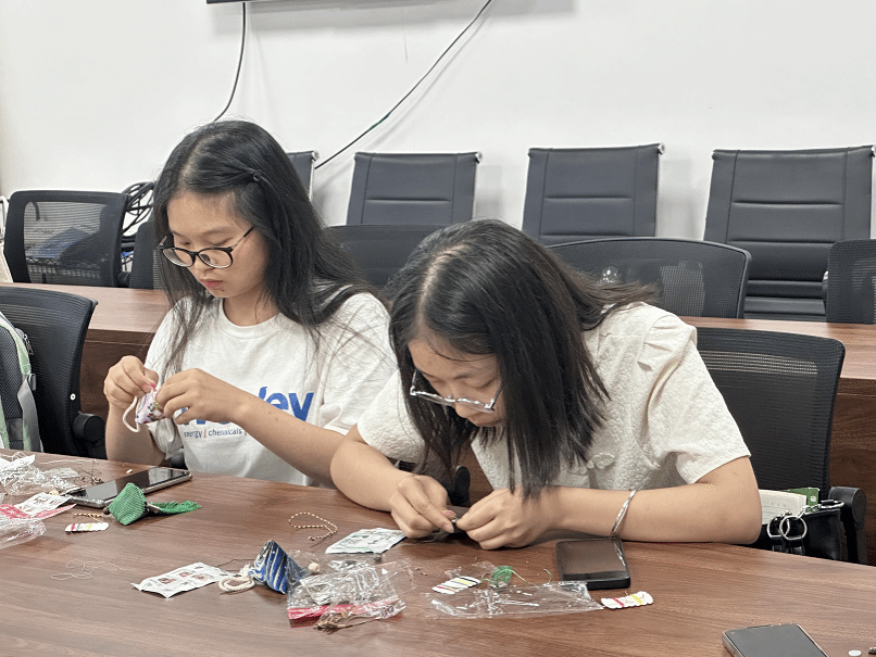 香囊制作环节,王霖与同学们交流香囊制作的步骤和技巧,从填充材料到缝制香囊,每一步都进行了耐心的示范和指导。经过一个多小时的努力,同学们成功制作出了属于自己的香囊,大家纷纷展示自己的成果,并借此机会,寄情于香囊,感恩老师,感恩公司,将香囊赠予了自己的老师,表达自己的感恩和祝福。
