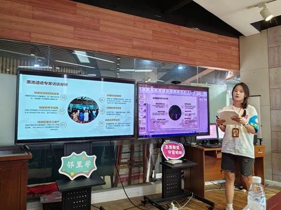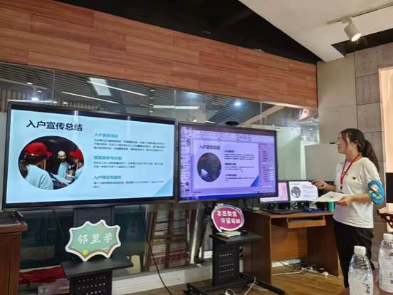 织梦小青数志愿服务队成员唐佳怡和冉玲玲分别代表团队对墨池文化调研、社区入户宣传调查工作、夏令营活动以及八一文艺汇演的工作进行了总结汇报,两位同学通过内容翔实的PPT,展现了他们在实践活动的主要内容、所见所闻、所思所感,让在场的参会人员深深地感受到她们在实践活动中付出的努力和收获。
