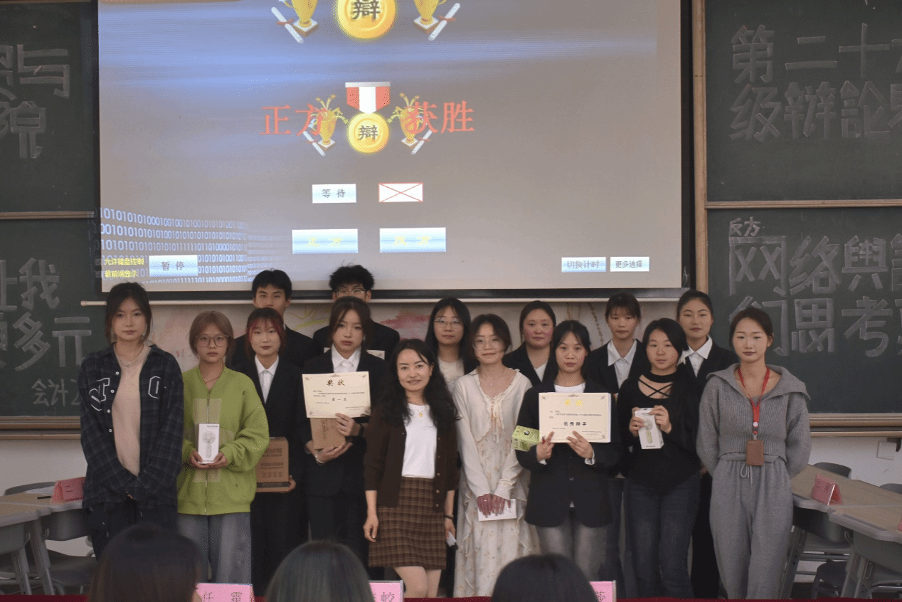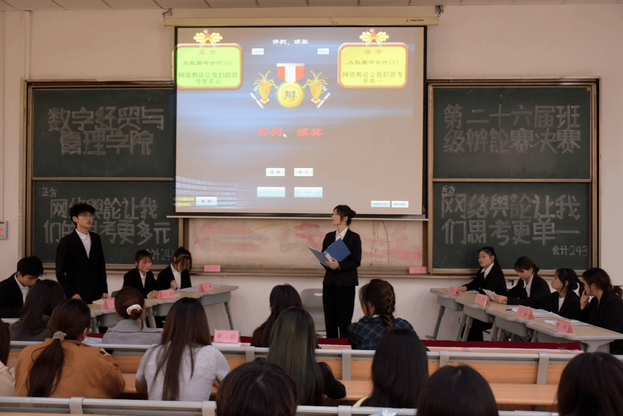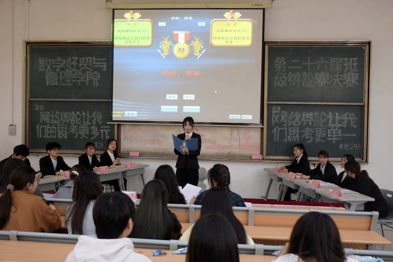 经评委公正公开评议,正方大数据与会计班241赵璐阳与反方大数据与会计243班易雪凭借缜密的逻辑与机敏的临场反应荣获“优秀辩手”称号。最终,大数据与会计241班摘得桂冠,大数据与会计243班荣获亚军,连锁经营与管理242班获得季军。