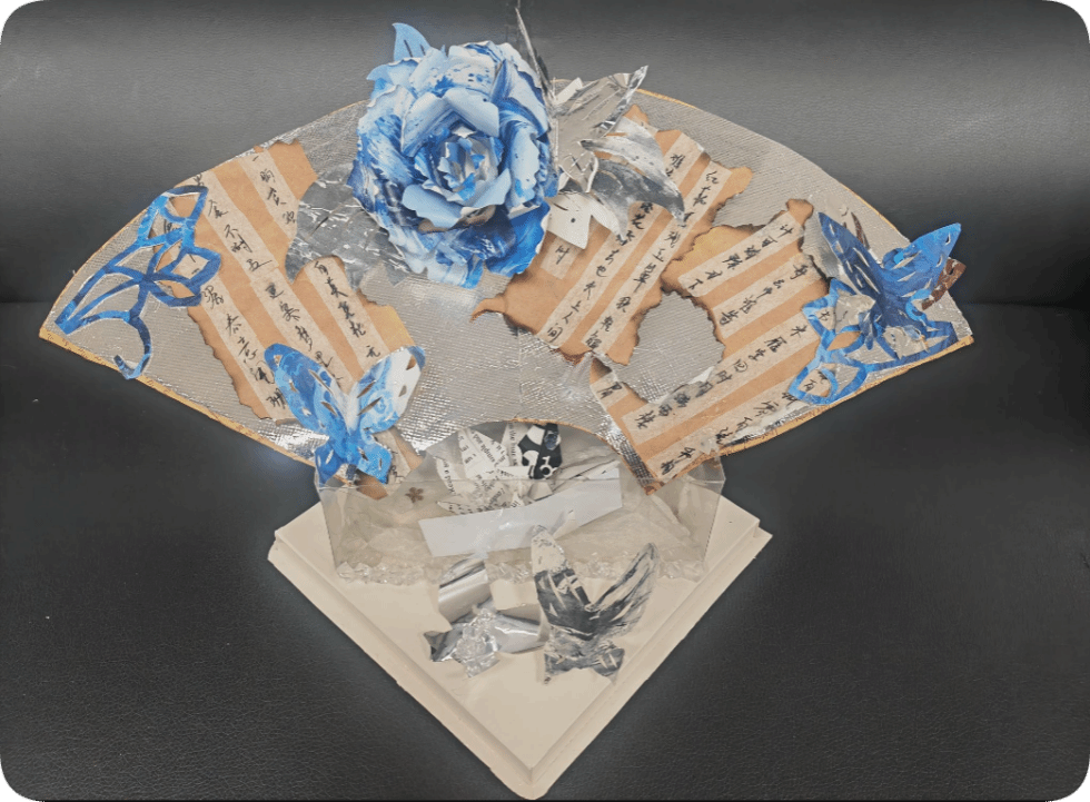 寝室91611黄静蕾同学制作的“幽蓝秘笺”荣获一等奖,蓝色纸花与古文书笺融合,花影绰约,精巧的结构设计和环保理念获得评委一致好评。她分享作品时谈到:“在动手制作时,挑战与惊喜并存,过程中遭遇结构不稳、设计修改等问题,但通过摸索与调整去碰撞新的灵感,最终呈现出完整的作品,这种创新设计带给自己满满的成就感。”