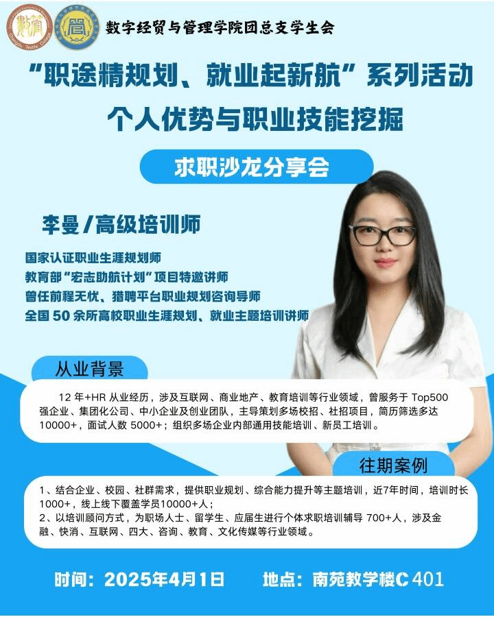 李曼老师以个人优势解析、优势挖掘方法、能力发展模型及案例分析为主要内容,引导同学们剖析自身优势,掌握优势挖掘方法,搭建能力发展模型,助力同学们提升职业竞争力。