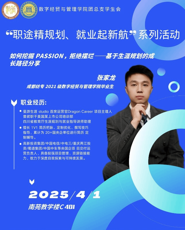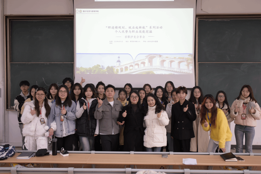 4 月 1 日下午,qm球盟会网站在南苑致知楼 C401 举办“职途精规划,就业起新航”求职沙龙分享会,邀请国家认证职业生涯规划师李曼老师和公司 2021 级优秀毕业生张家龙学长为同学们分享求职经验,活动指导老师唐梦蛟、公司党员代表以及大一大二各班同学代表参加分享会。