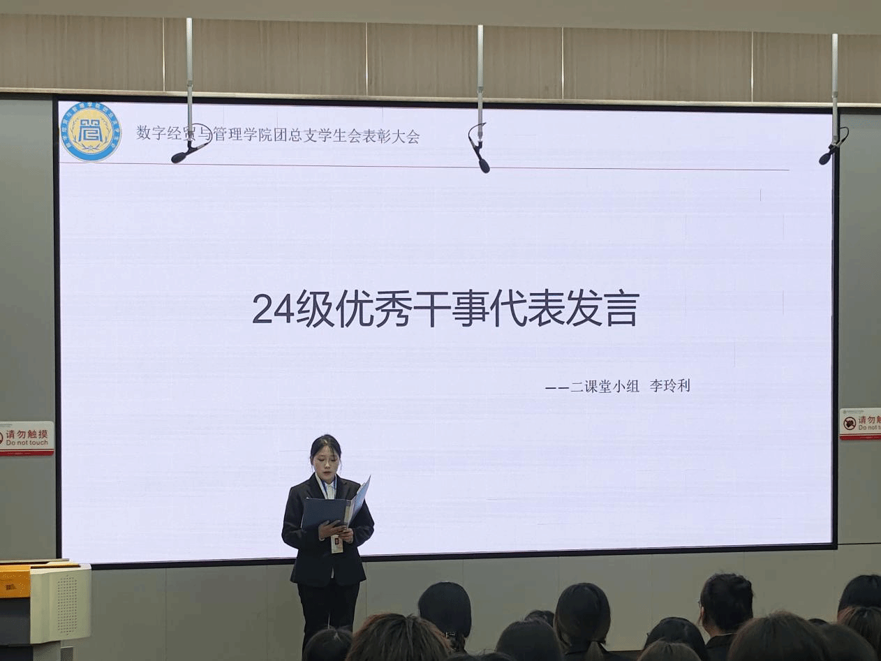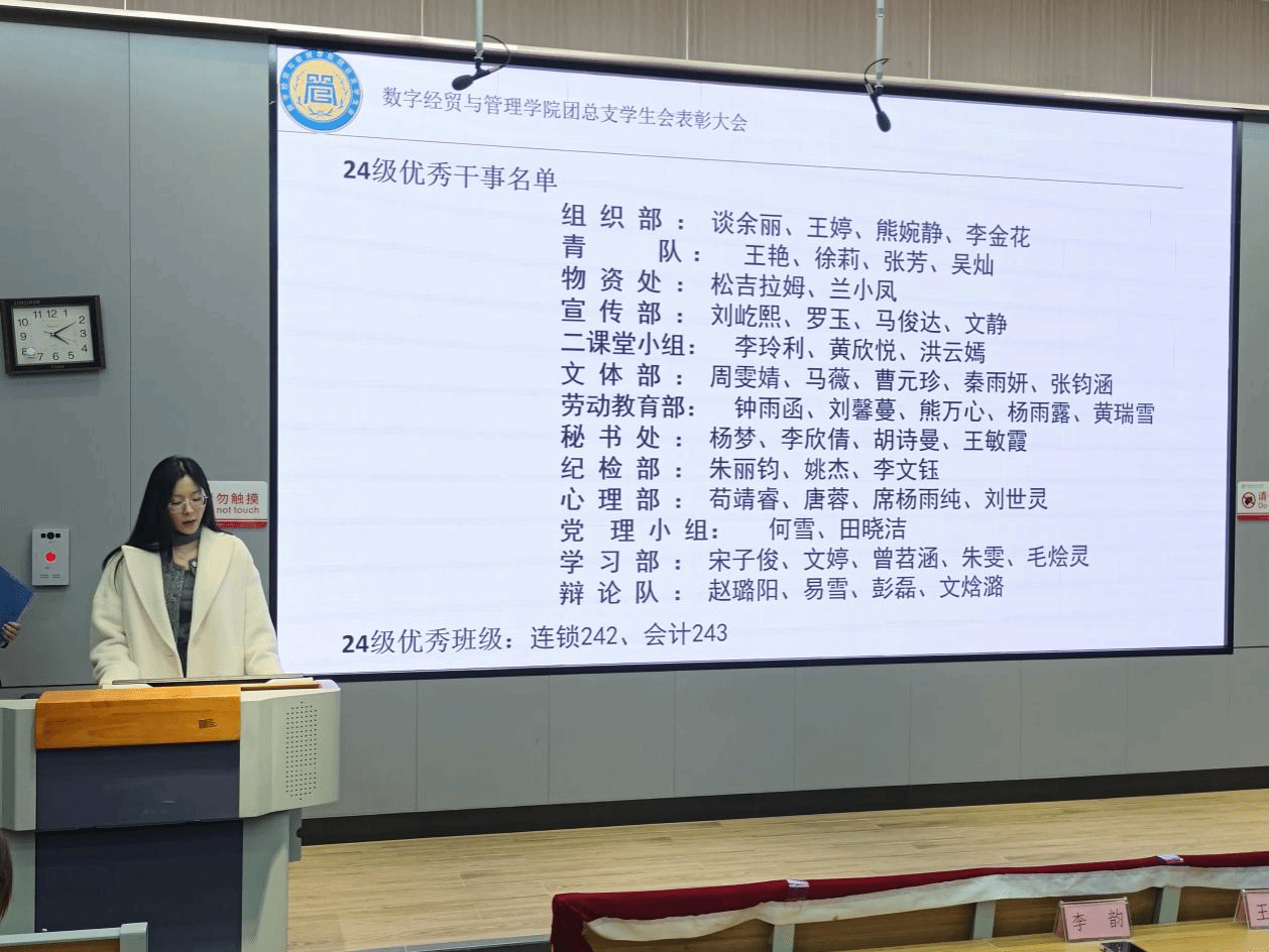 大会第三项议程李韵宣读优秀员工干事名单,表彰他们在过去一年里的辛勤付出与杰出表现。