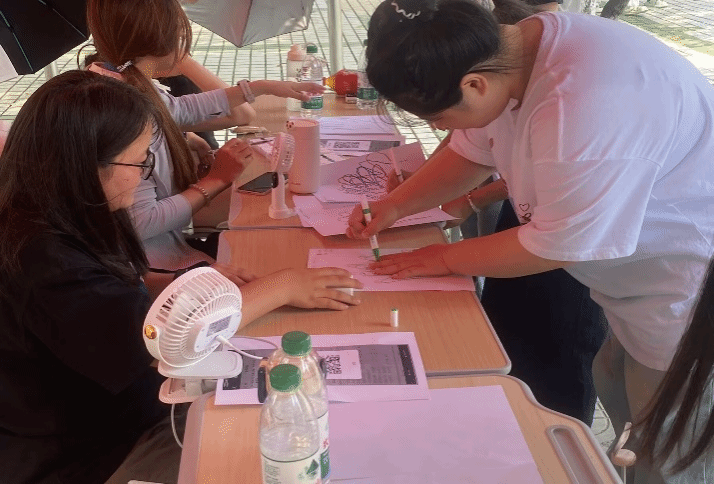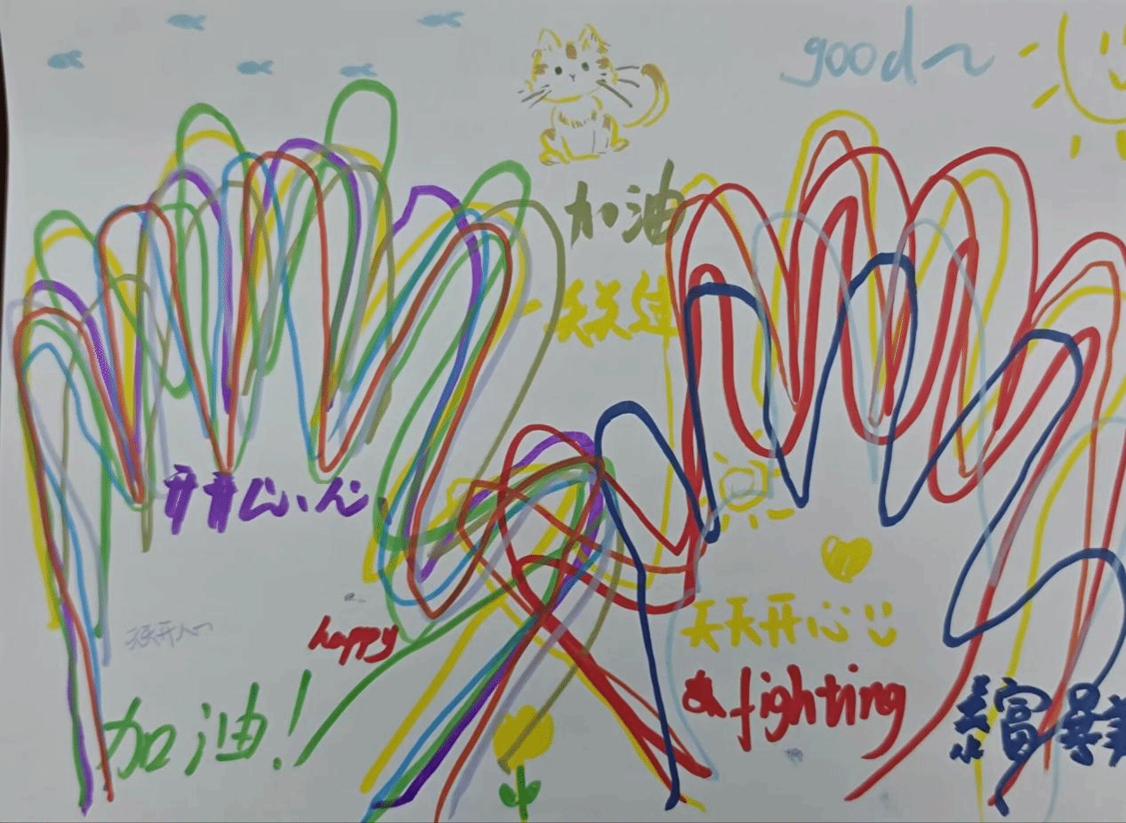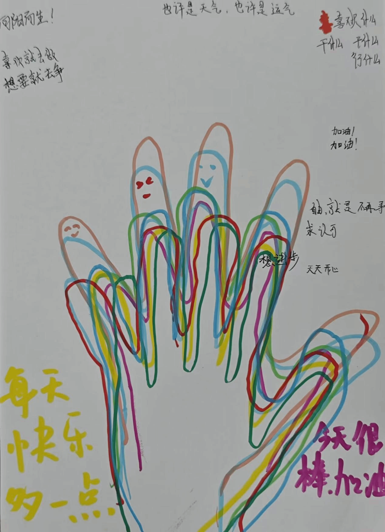 活动中,参与的同学们纷纷拿起纸笔,专注地在纸上勾勒出自己手掌的轮廓,随后,他们或沉思片刻,或提笔即书,将内心的心愿与烦恼悉数书写于掌心形状的空白处。有的同学写下对未来学业进步的期许,有的倾诉着成长中的困惑与迷茫,通过这种极具创意的方式,大家得以自由且私密地表达内心深处的想法与情感。随着参与者增多,一幅幅由众人共同完成的“手掌画卷”逐渐成型,象征心灵的联结与集体的温度。