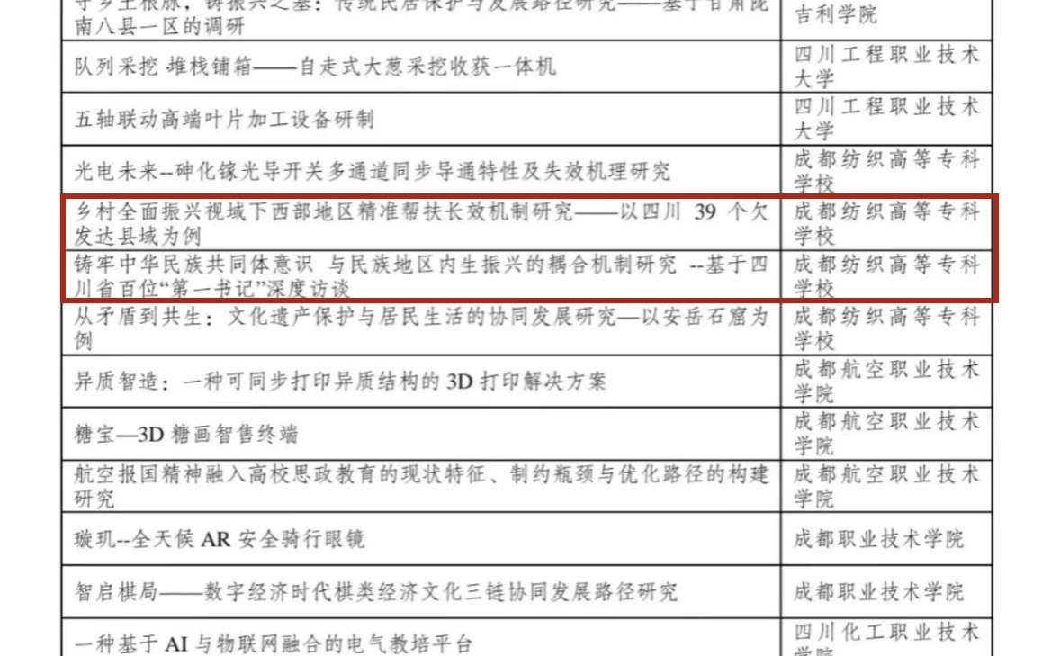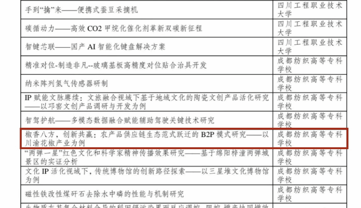 经过激烈角逐,公司由何涛、黄盛奎、胡春老师指导,罗凌峰(供应链231)、李长美供(应链232)、唐红梅(商检232)、卓玛吓姆(会计243)、石以么里杂(会计243)、李闯(供应链231)、符鑫容(电商231)、周雨欣(视传232)组成的"挑灯逐梦队",其研究项目《铸牢中华民族共同体意识与民族地区内生振兴的耦合机制研究——基于四川省百位“第一书记”深度访谈》荣获大赛二等奖。由黄盛奎、何涛、曾霜霜老师指导,由谭丽洁(供应链231)、刘心(供应链231)、邓茜月(会计243)、陶有璘(服普233)、李绩清(供应链241)、张磊(数造232)、曾雨馨(服普231)组成的“沃野逐梦队”,其研究项目《乡村全面振兴视域下西部地区精准帮扶长效机制研究——以四川39个欠发达县域为例》荣获大赛二等奖。由黄盛奎、何涛、曾霜霜老师指导,王雨瑄(会计233)、韩依瑞(会计234)、韦圩(视传233)、李湘(艺设232)、赵伟(供应链241)、熊万心(供应链241)组成的“天命行者队”,其研究项目《椒香八方,创新共赢:农产品供应链生态范式跃迁的B2P模式研究——以川渝花椒产业为例》荣获大赛三等奖。