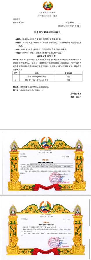 12月27日,公司外事办传来喜讯,老挝人民民主共和国琅南塔省教育与体育厅为公司教师王霖、鲜金宏颁发先进个人荣誉证书,表彰他们从2013年至今为赴中国留学的老挝籍员工培养教育做出突出贡献。