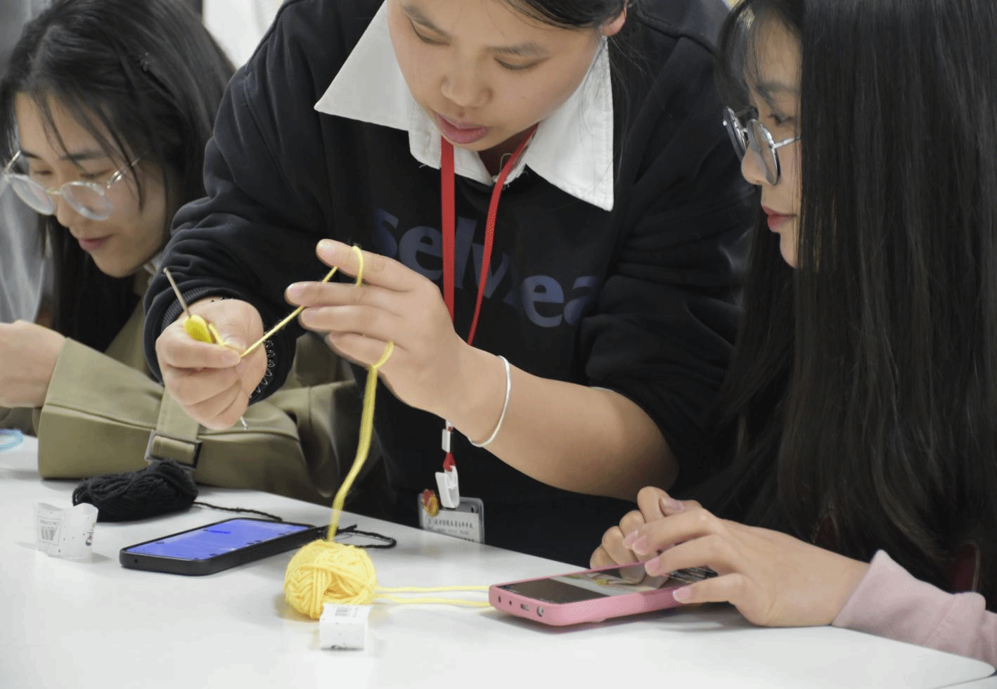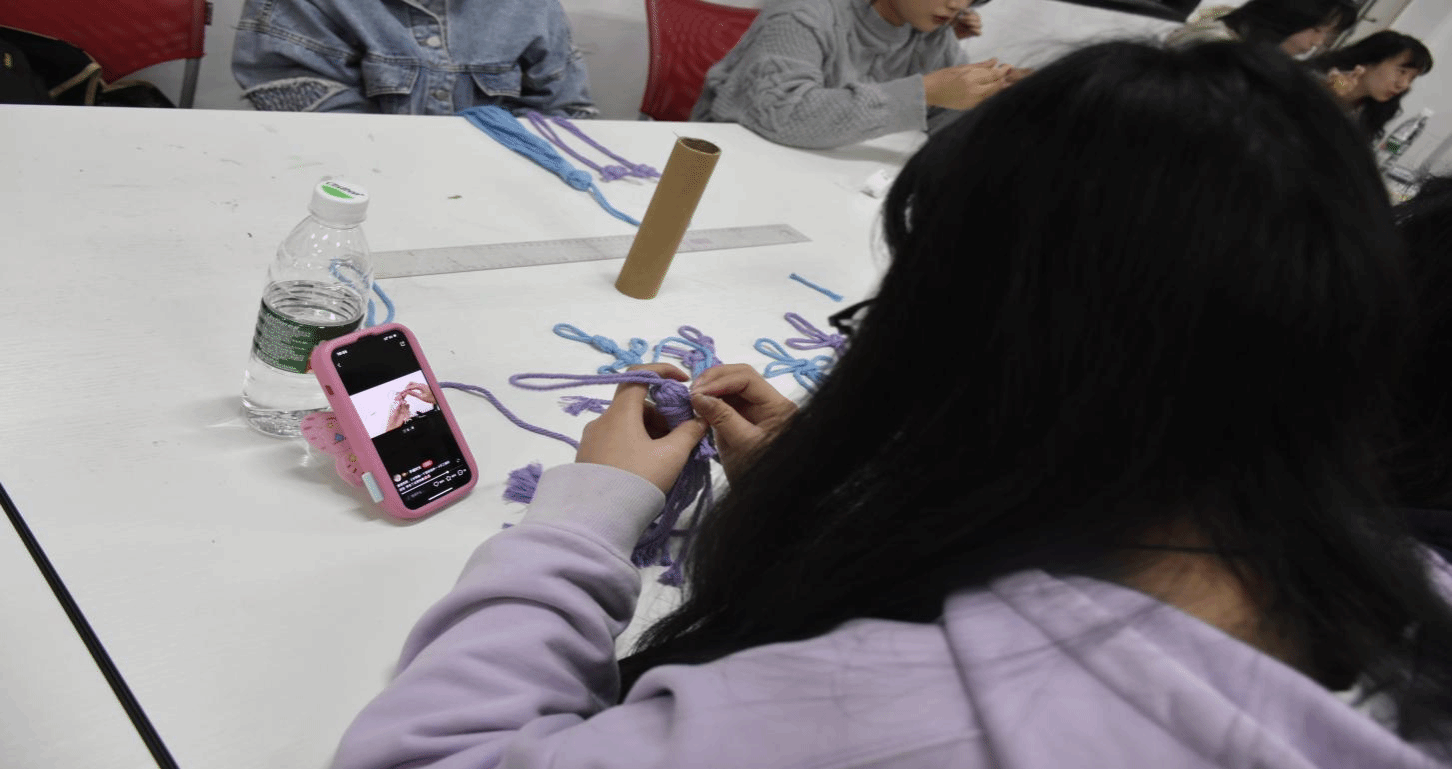 在经纬工艺协会的现场指导下,同学们通过视频教学、现场演练、修正调整、不断尝试,最终巧妙地将一根根彩线编织成各种造型,感受到了传统手工艺的魅力。
