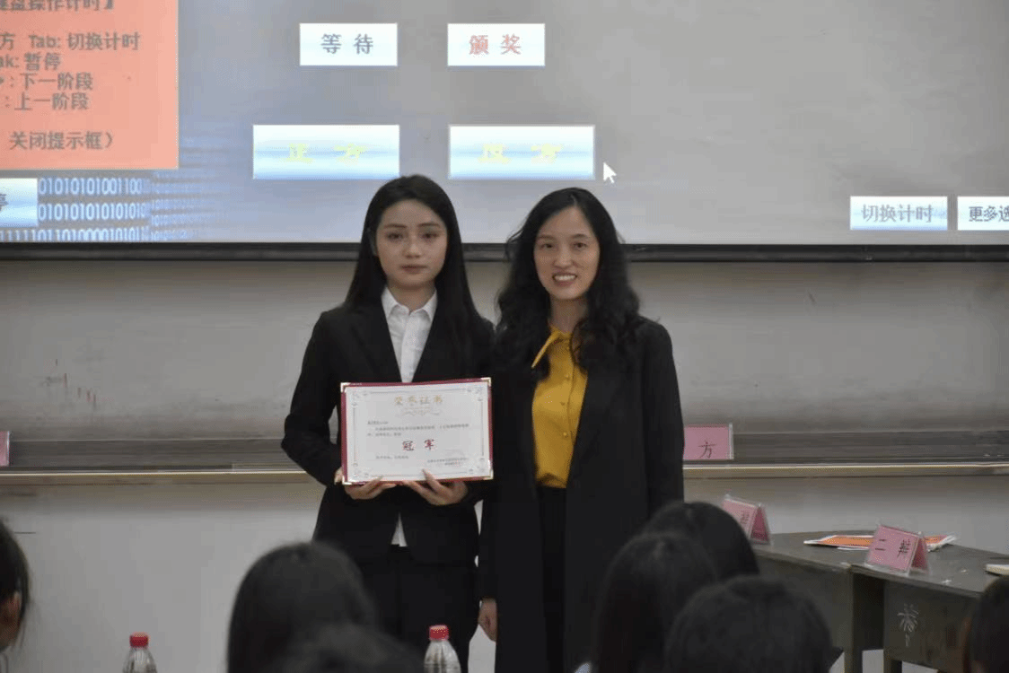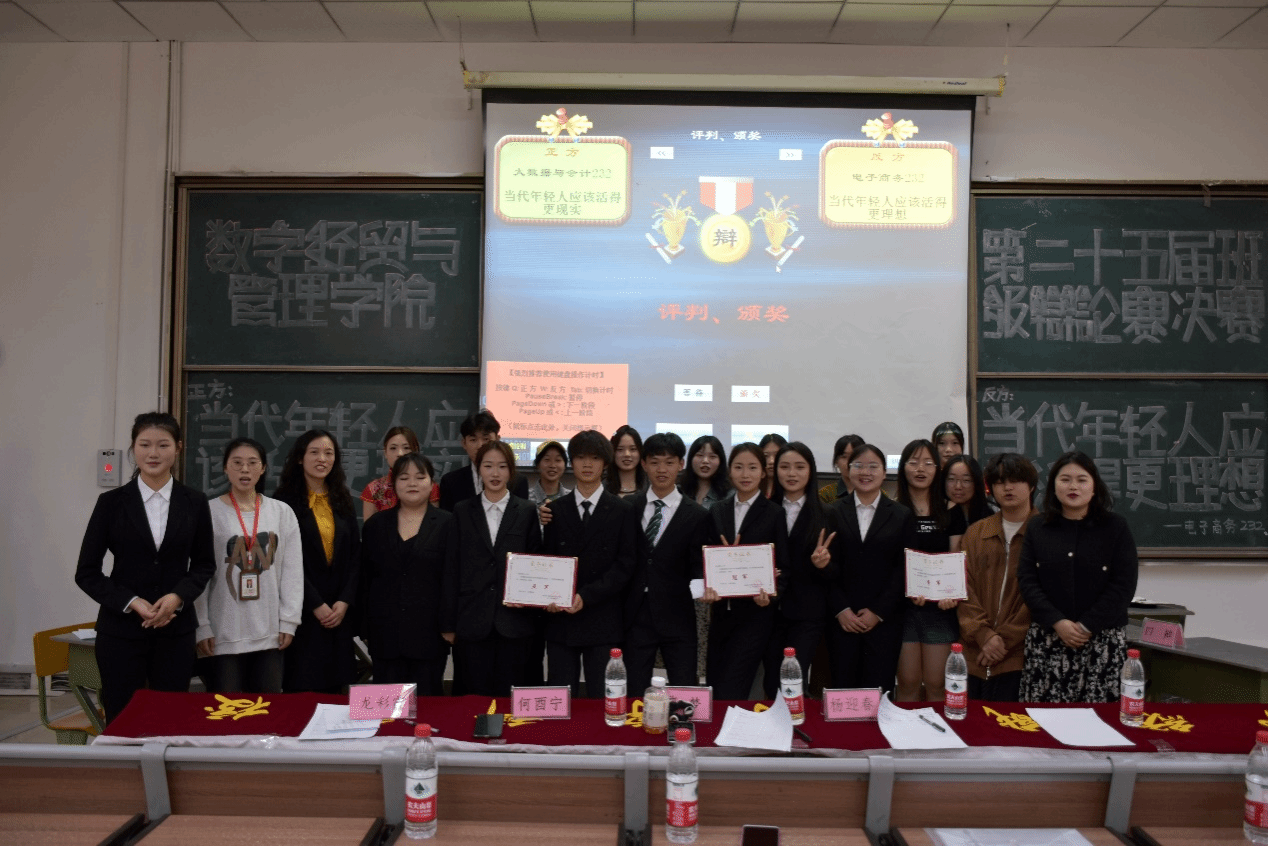 经过评委们公平公正的评议,最终公布此次辩论赛的优秀辩手分别是正方大数据与会计232班的任霜和反方电子商务232班的晚清,电子商务232班荣获冠军,大数据与会计232班荣获亚军,大数据与会计233班荣获季军,总支副书记兼团总支书记何酉宁为他们颁发奖状。