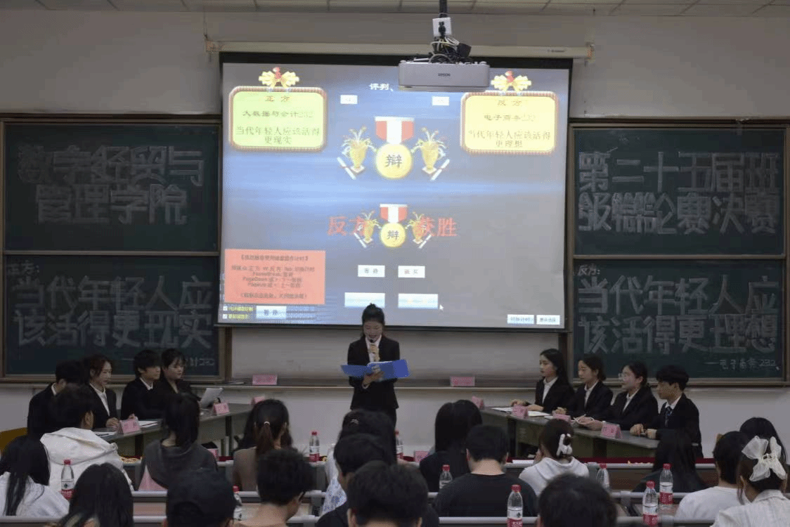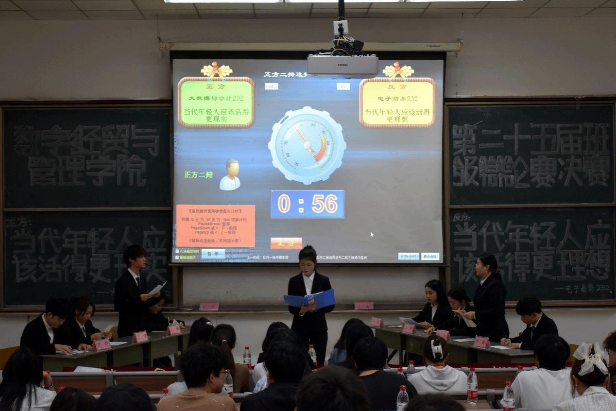 辩论赛总决赛的辩题是“当代年轻人应该活得更现实”和“当代年轻人应该活得更理想”。正方辩论队来自大数据与会计232班,反方班辩论队则来自电子商务232班。此次总决赛共分为六个环节,分别是开篇立论、攻辩环节、攻辩小结、自由辩论、总结陈词、观众提问。