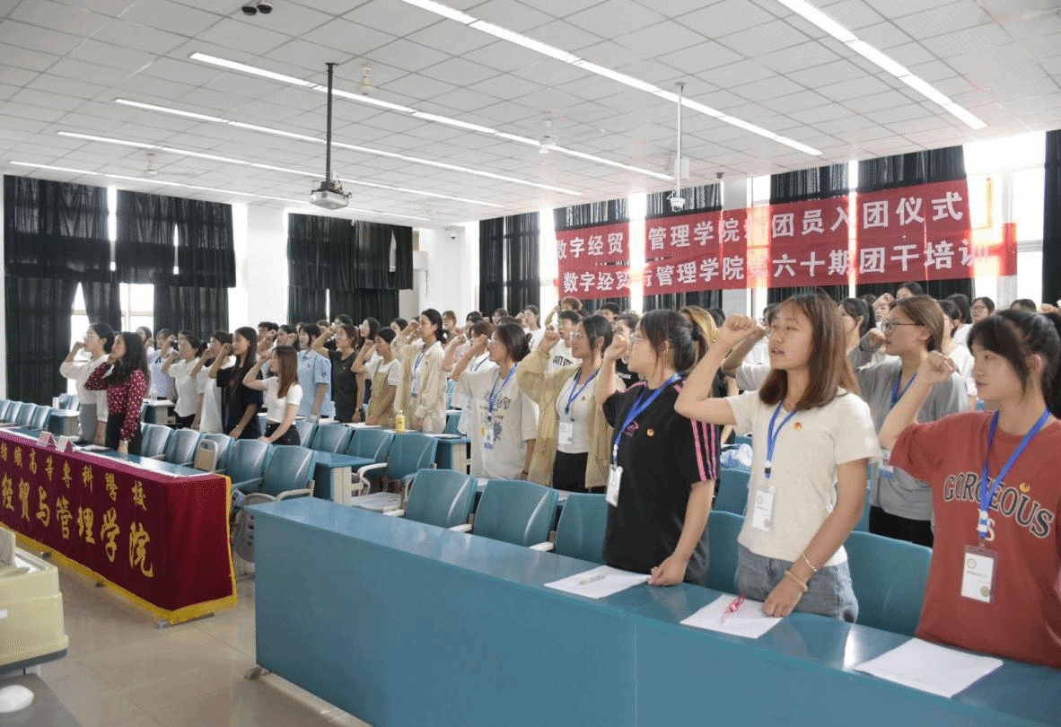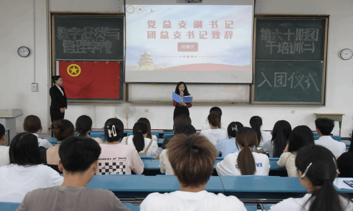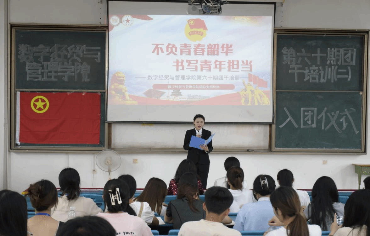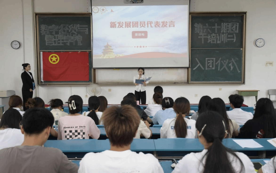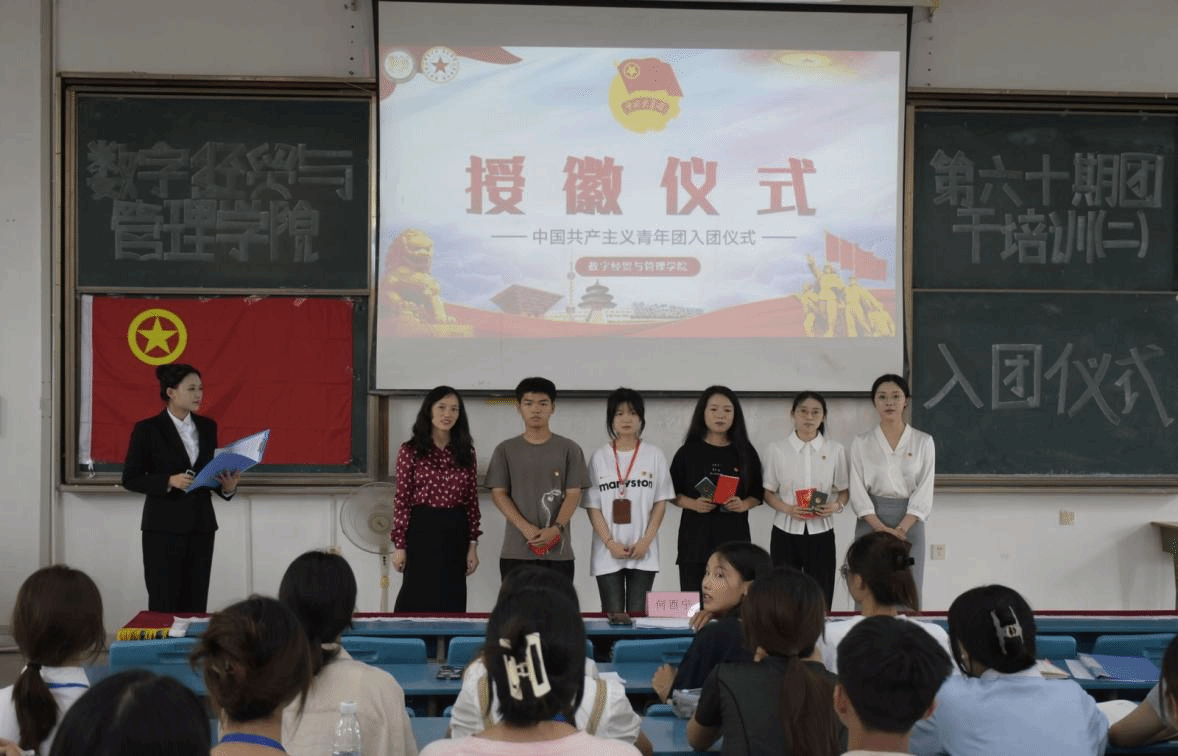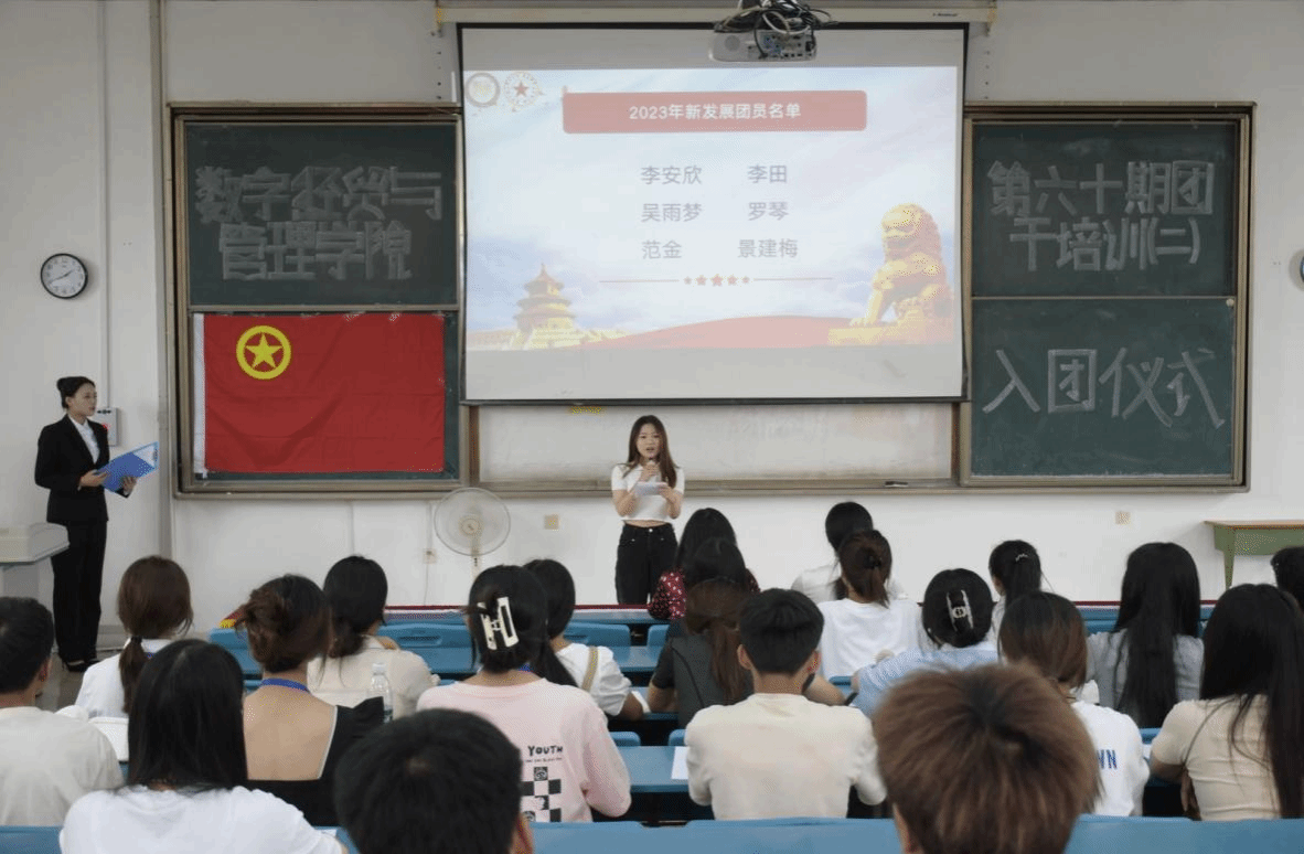 入团仪式开始,全体人员起立,齐唱国歌,接着由主席团成员骆嘉宣读李安欣等6名新入团团员名单,何酉宁、李韵为新发展团员佩戴团徽并颁发共青团章程。