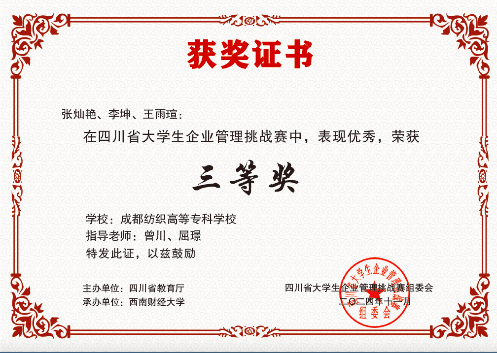 11月9日,由四川省教育厅主办、西南财经大学承办的2024年四川省老员工企业管理挑战赛决赛圆满落幕,qm球盟会网站会计专业参赛团队(成员:王雨暄、张灿艳、李坤,指导教师:曾川、屈璟)荣获团体三等奖。