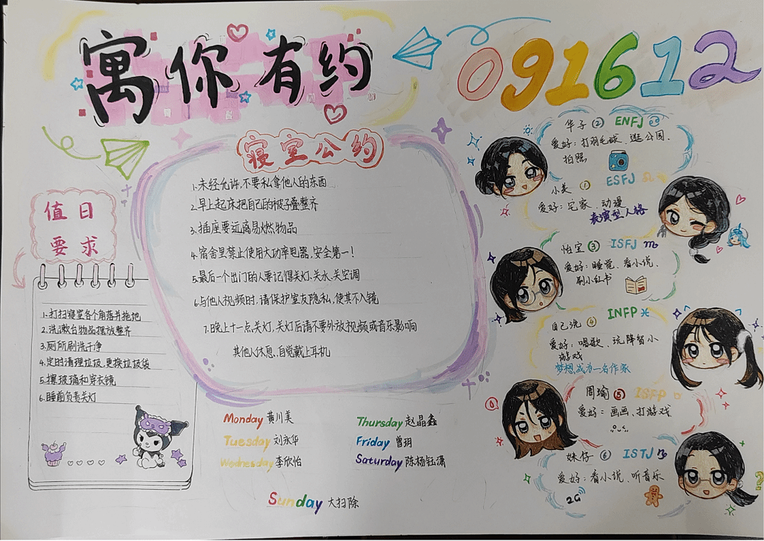 活动要求大一同学以寝室为单位全员参与,同学们依据6S寝室建设规范,就作息时间、寝室安全卫生、行为规范等方面,按照公司规章制度以及专业特色,制定并共建寝室专属公约。