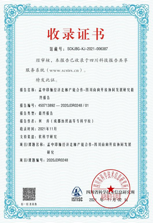近日,公司何涛教授课题组承担的四川省科技计划项目“孟中印缅经济走廊产能合作-四川南向开放协同发展研究”(2020JDR0248)顺利通过省科技厅结题验收。课题组取得的“国际产业链重构新动向与四川加快南向开放的思考”等研究成果具有一定学术和应用价值,结论及建议结合了四川及西南对外开放需求实际,可供四川省有关部门在贯彻“十四五”规划工作中参考,得到专家组好评。