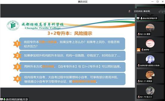 唐主任就在校自考专升本套读、3+2专升本(统招专升本)两个途径,为同学们提升学历做了详细具体、切合实际的建议和指导。
