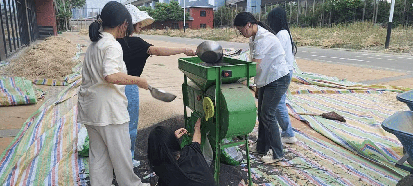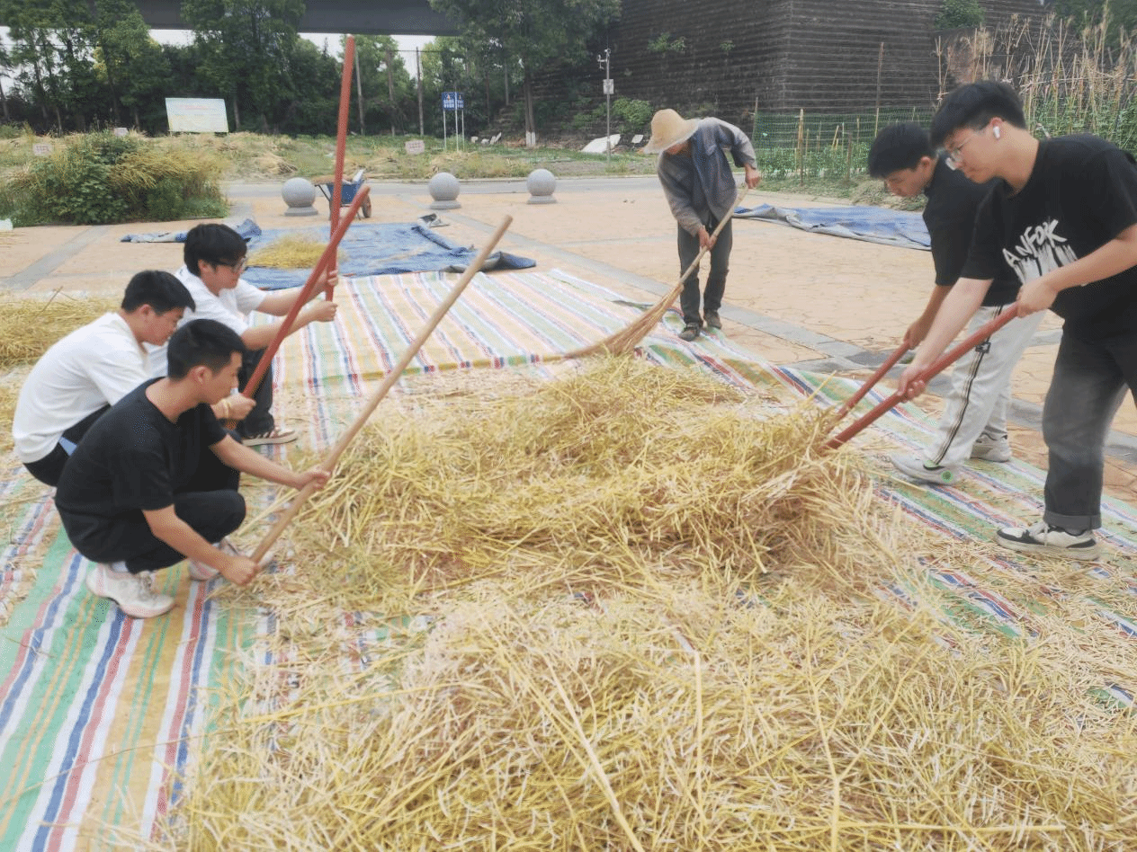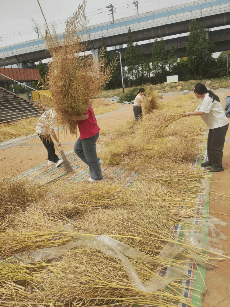 晾晒环节。同学们将割下的油菜整齐地铺在空地上晾晒,在阳光的照耀下,金黄的油菜仿佛闪耀着光芒。他们还不时地翻动着油菜,让每一缕阳光都能亲吻到饱满的豆荚。