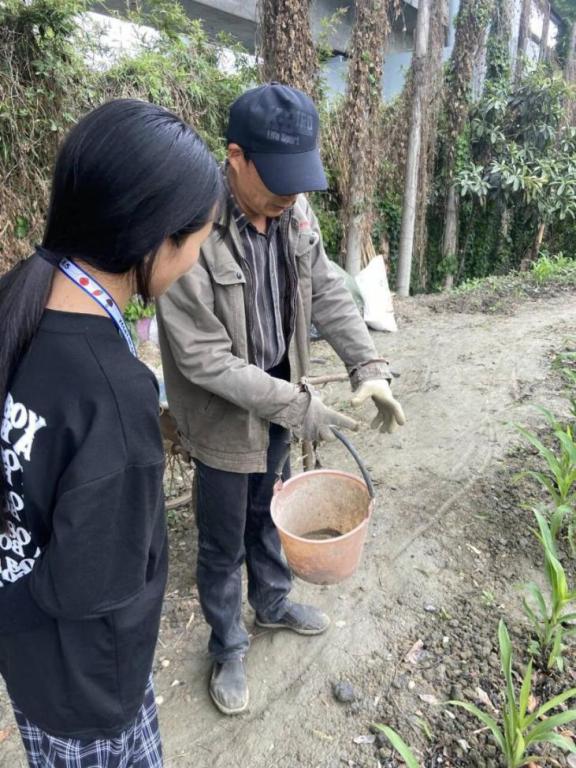 冉老师指导同学们如何浇水、施肥,讲解作物生长周期与过程。
