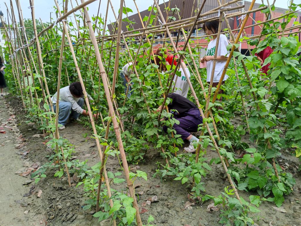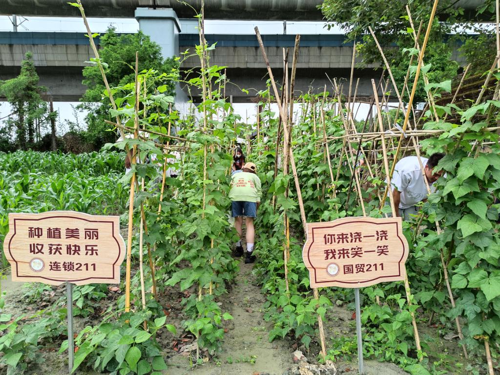 5月13日一早,连锁经营211和国际贸易211两个班的同学们与公司经理、书记及老师们,分两批次陆续到公司种植劳动教育实践基地摘蔬菜——四季豆,尽管天公不做美,阴雨绵绵,也抵挡不住同学们亲手采摘自己所种蔬菜的丰收喜悦。